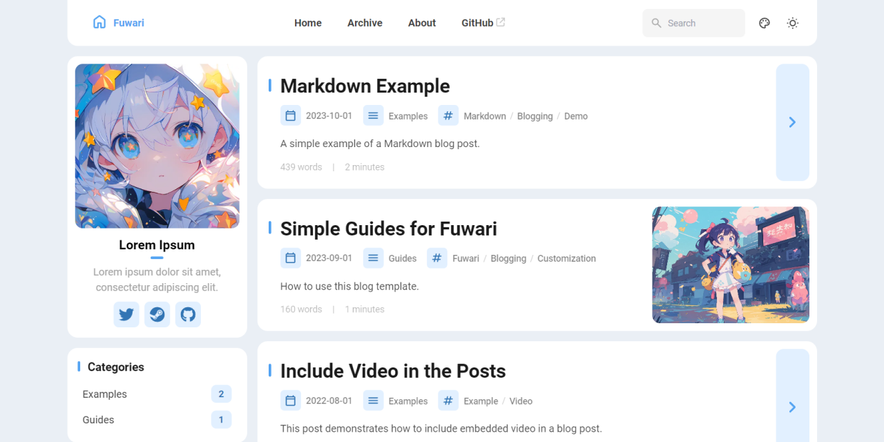 公式テンプレートと近しい構成でデザインがまとまっていて、レイアウトが大きく変わらないテーマを探したところ、fuwari系のテーマが該当した。